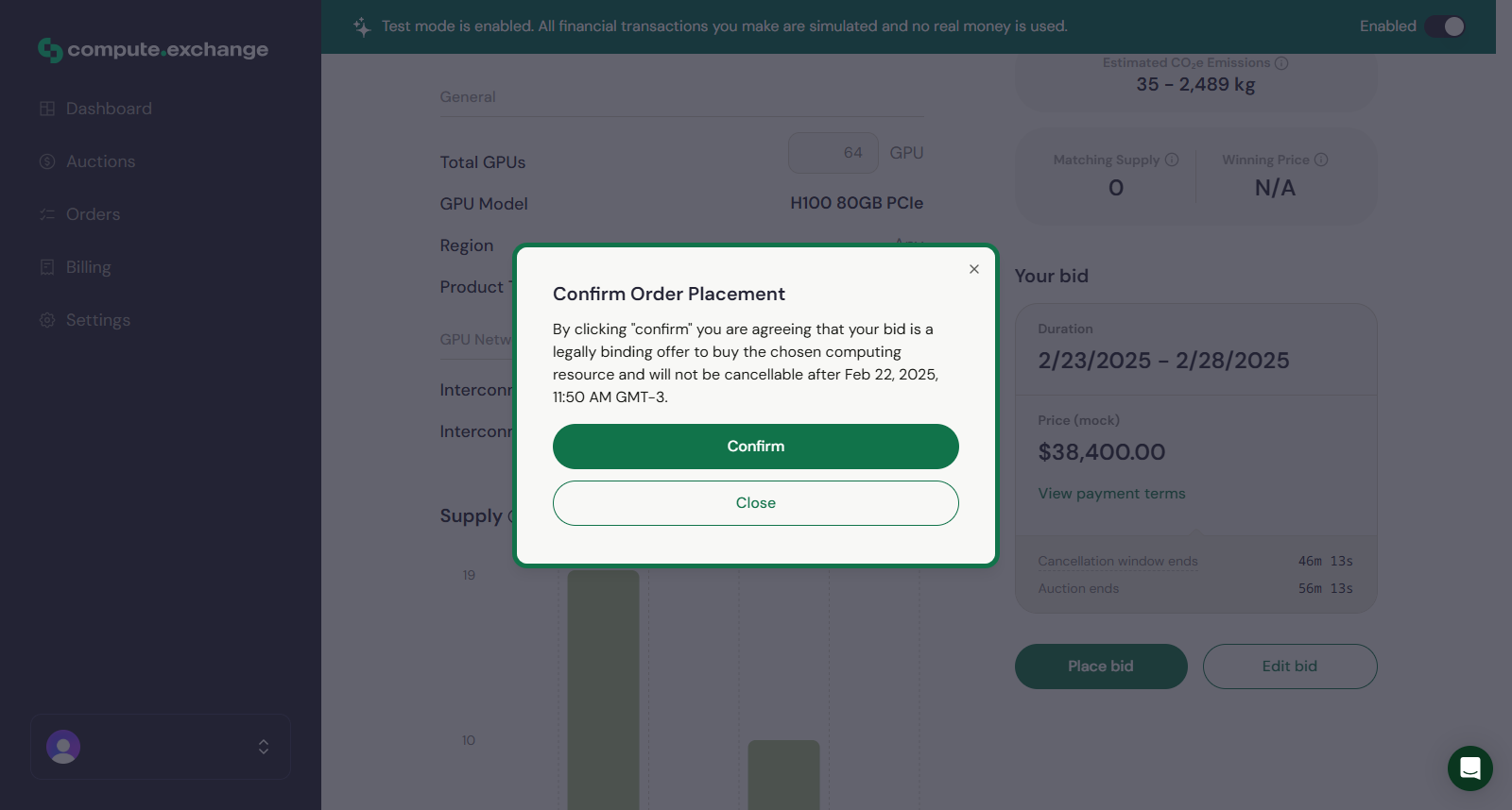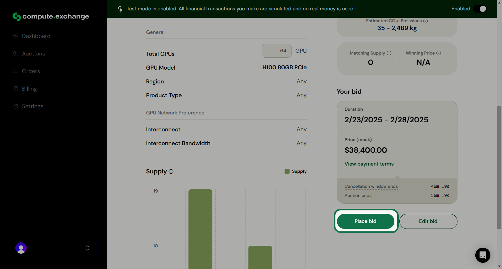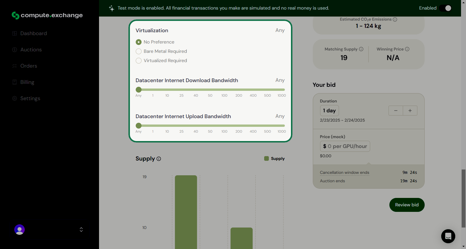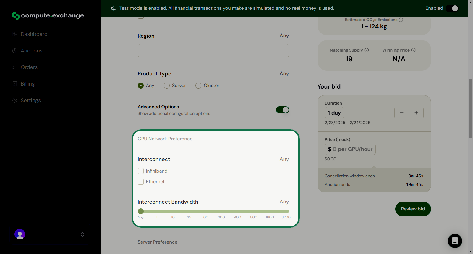After clicking Review Bid you will see a summary of your selections. Carefully check all details, including:- GPU quantity and model.