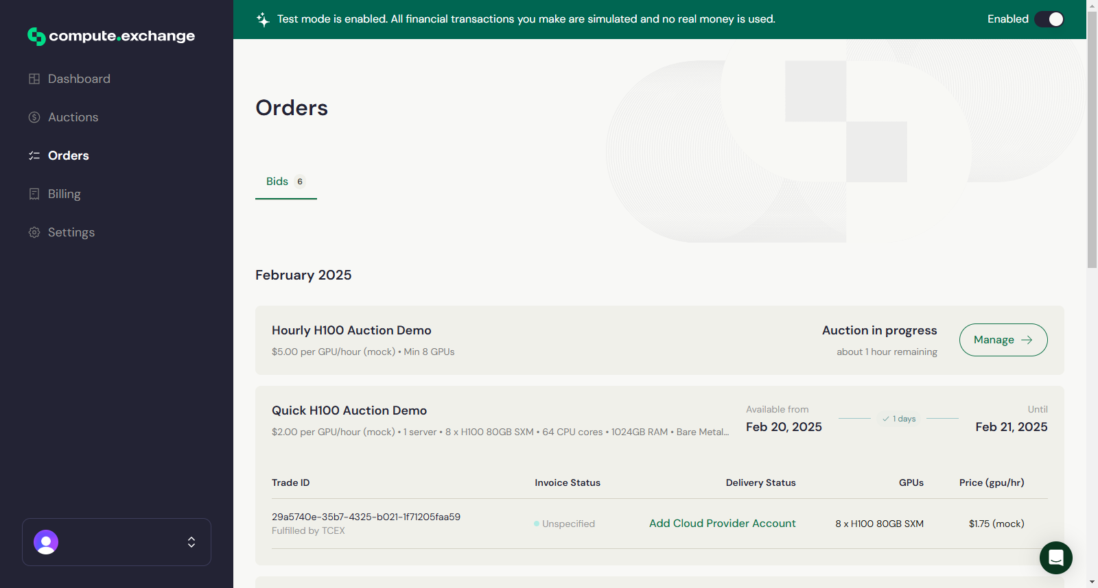 After signing in to Compute Exchange, you will be redirected to your Dashboard, where you can view a list of active auctions.