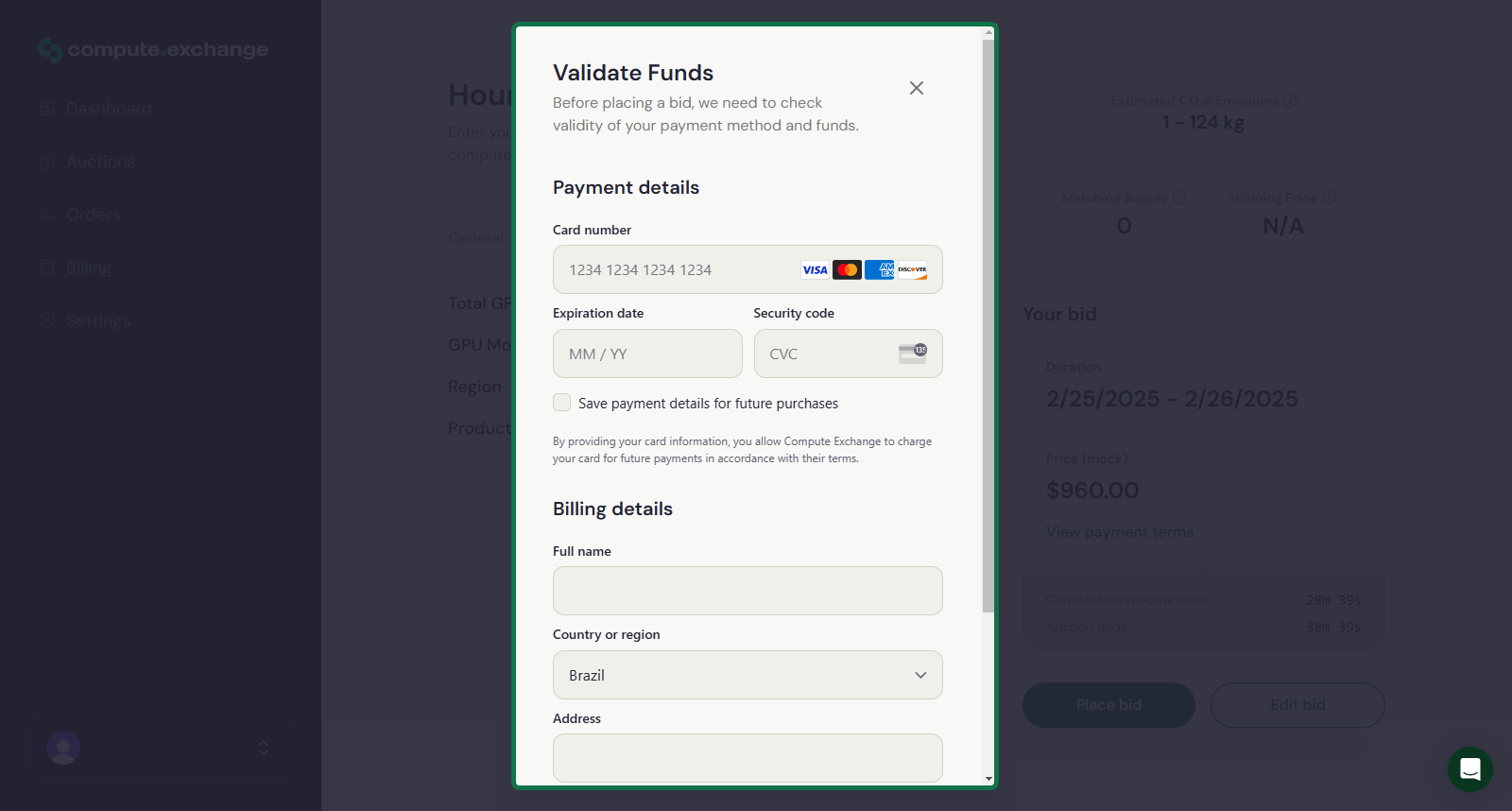 If no payment details have been added to your account, upon submitting the bid, a window will pop up requesting that you input valid credit card information to perform a temporary charge to check the validity of your payment method and funds.